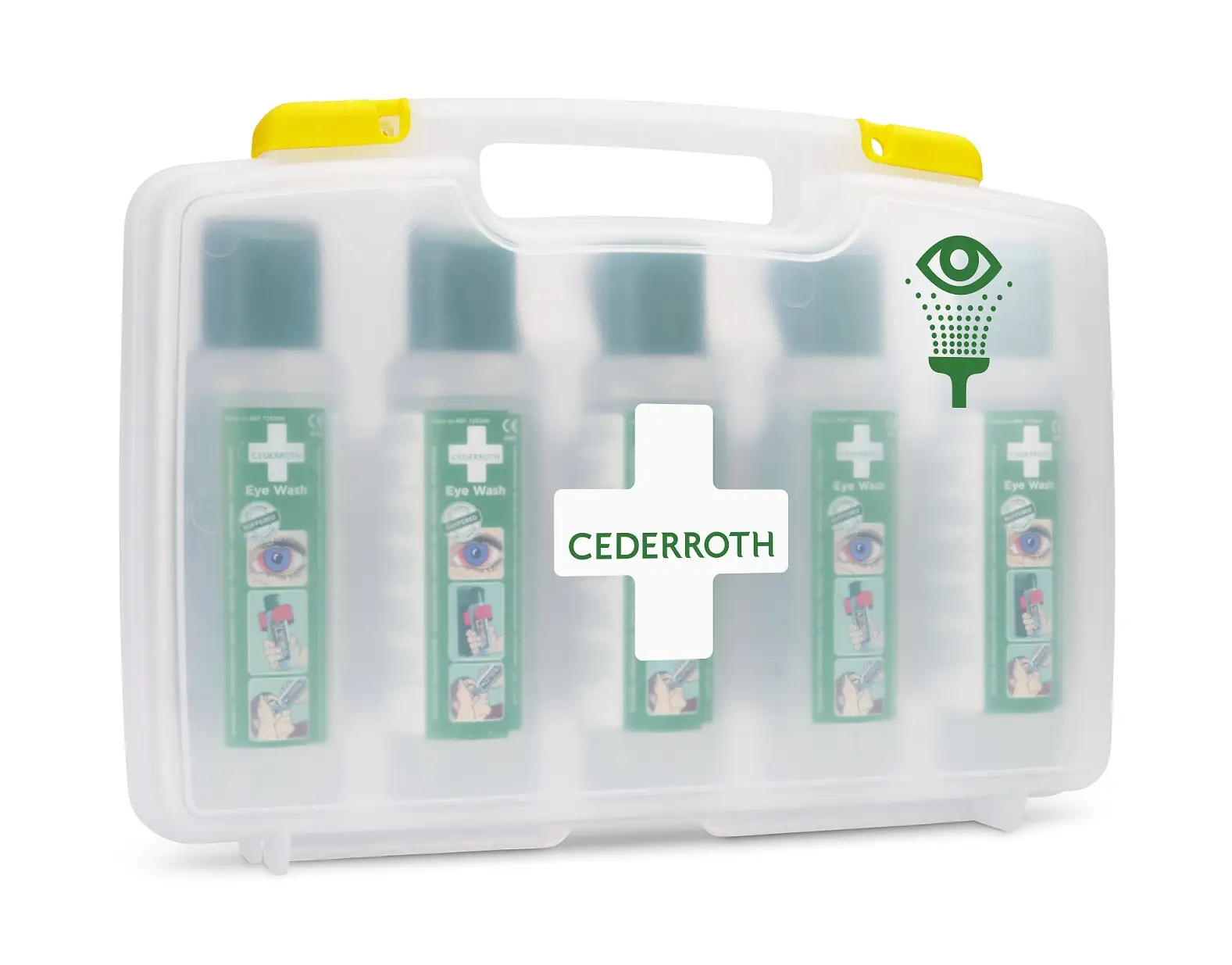 Cederroth Augendusche (5 x 500ml) im Koffer. Ideal zum Mitnehmen, für Arbeiten unterwegs oder während des Transports ins Krankenhaus. Robuster, durchsichtiger Koffer aus Hartkunststoff mit Griff. Leicht zu öffnen: Die gelben, robusten Schiebeverschlüsse werden einfach zur Seite geführt. Mit der Wandhalterung (CED51011041) auch an der Wand aufhängbar.