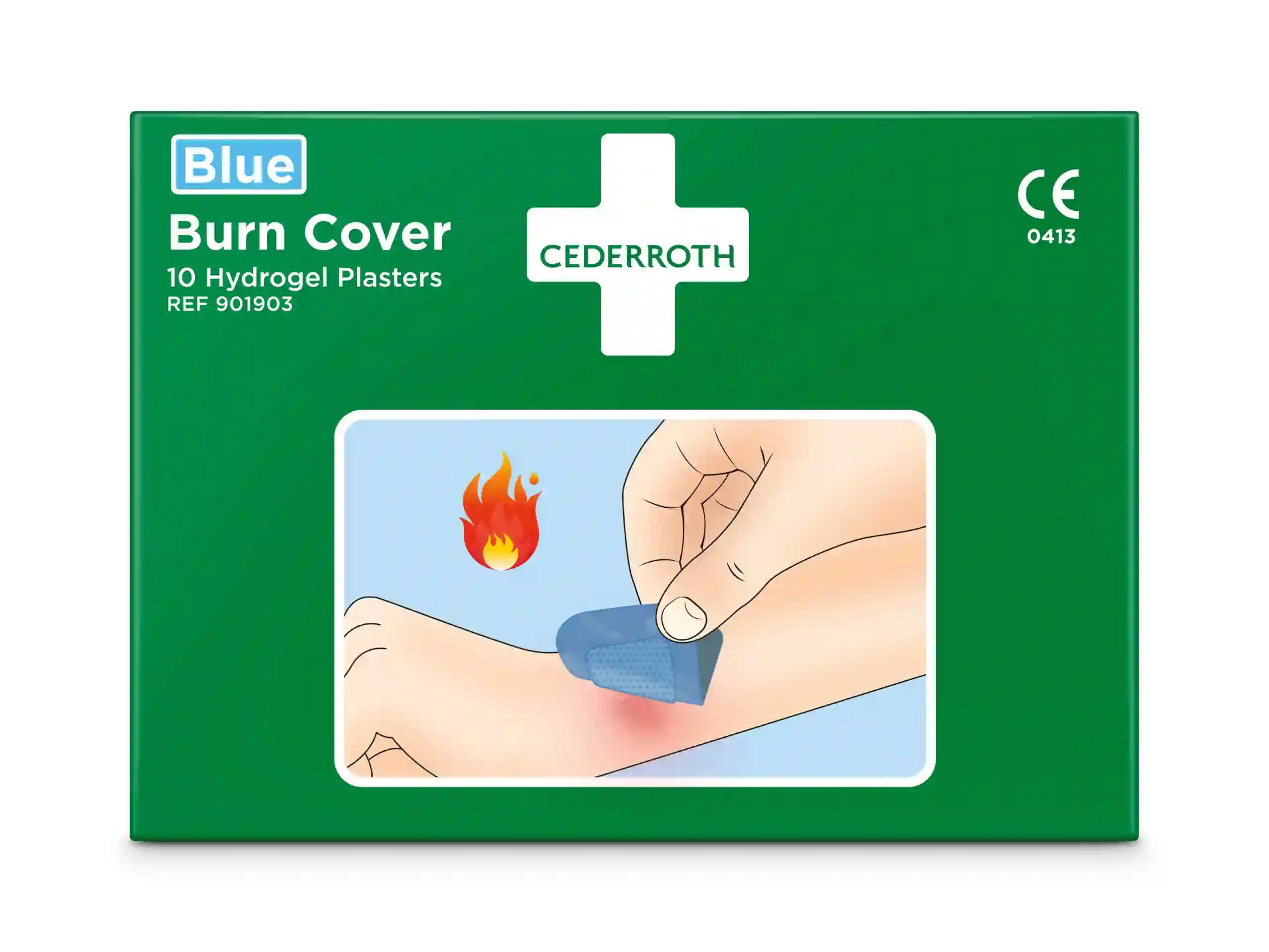 Burn Cover ist ein wasserdichtes Hydrogelpflaster, das zum Schutz und zur Linderung bei kleineren Verbrennungen. Es ist auch für kleinere Schnitt- und Schürfwunden ideal. Mit seiner blauen Farbe ist es zum Einsatz in Lebensmittelbetrieben geeignet. Die Wundaufl age besteht aus Hydrogel, das nicht an der Wunde haftet. Wasserdicht und steril. Vor der Wundversorgung mit Burn Cover die Brandwunde mindestens 20 Minuten lang kühlen, beispielsweise mit Cederroth Burn Gel oder durch Spülen mit lauwarmem Wasser. 10 Pflaster/Verpackung (74 x 45 mm).