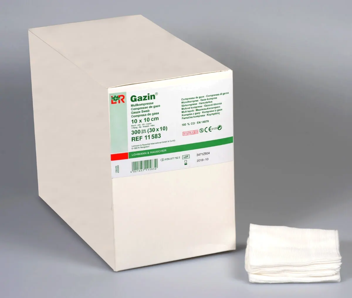 Gazin Mullkompressen sind weich, saugfähig und luftdurchlässig. Da alle Schnittkanten innen liegen, sind keine Randfäden vorhanden. Das Sortiment umfasst sterile Mullkompressen ohne sowie unsterile Kompressen mit oder ohne Röntgenkontrastfaden. Sterile Mullkompressen mit Röntgenkontrastfaden sind unter dem Markennamen Setpack verfügbar.