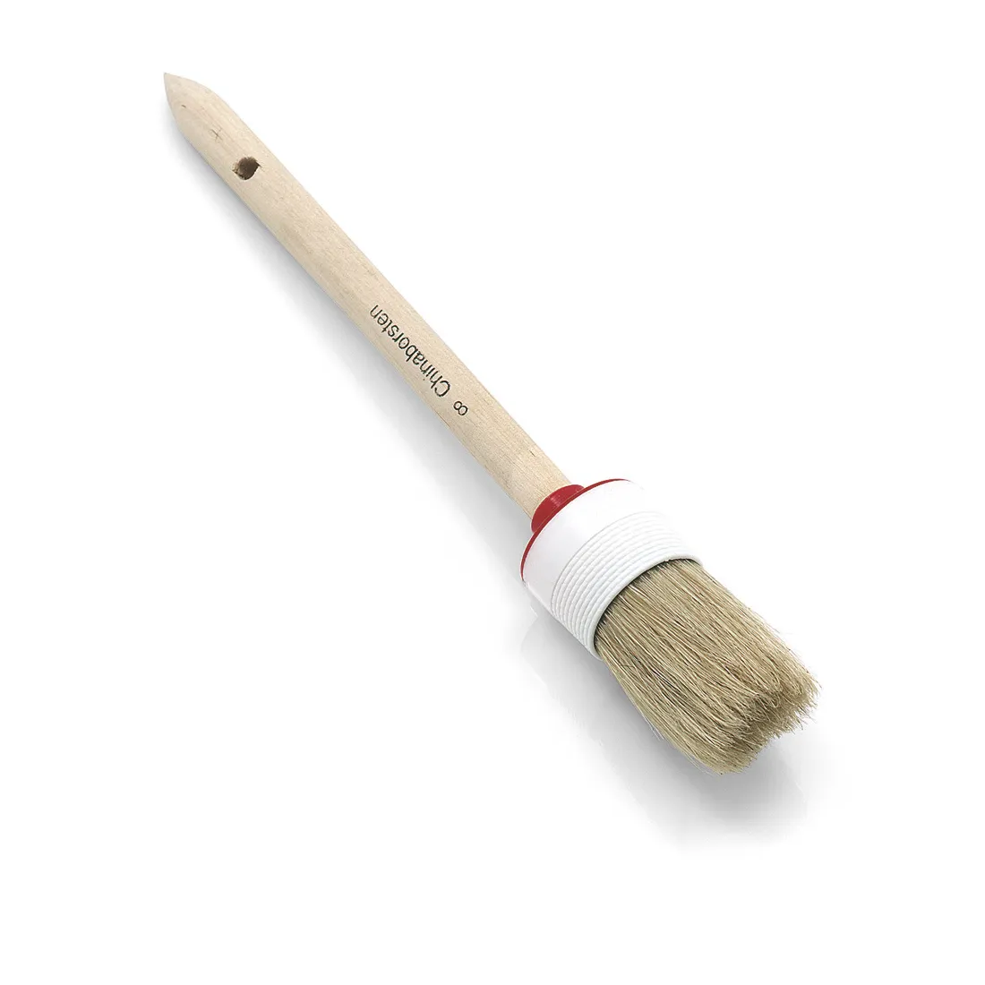 Industrie-Ringpinsel mit einer hellen Borstenmischung in der Größe 06. Die Borstenlänge beträgt 40 mm. Die Borsten sind fest im Metallring verankert und sorgen für einen gleichmäßigen Farbauftrag. Die Mischung aus natürlichen und synthetischen Borsten macht den Pinsel geeignet für verschiedene Lacke, Farben und Lasuren. Die Fassung besteht aus Kunststoff in weiß mit roter Kappe, der Stiel ist aus unlackiertem Holz gefertigt.