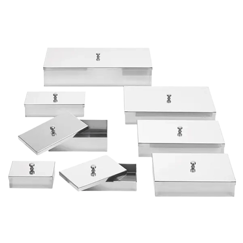 Produktinformationen "Instrumentenschale mit Knopfdeckel 20 cm x 10 cm x 5 cm aus Edelstahl"