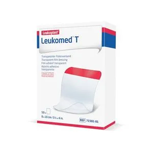 Ein Wundverband, zwei Anwendungen: Leukomed® T fixiert einerseits Katheter, Kanülen, Wundauflagen sowie medizinische Hilfsmittel wasser- und keimdicht. Andererseits werden nicht mehr sezernierende Wunden vor Reibung und Scherkräften geschützt. Hierdurch können auch dekubitusgefährdete Hautstellen entlastet werden. Durch die hohe Wasserdampfdurchlässigkeit der Folie werden Feuchtigkeitsansammlungen verhindert und das Risiko von Mazerationen reduziert. Die hochflexible, wasserdichte Folie bietet einen sehr hohen Tragekomfort und sitzt auch an Gelenken und Extremitäten wie eine zweite Haut. Leukomed® T ist steril und stellt einen zuverlässigen Schutz gegen Bakterien und Viren dar. Die abgerundeten Ecken gewährleisten eine sichere Fixierung. Die Transparenz ermöglicht eine kontinuierliche Inspektion der Wunde oder Fixierung. Das intuitive Applikationssystem mit dem roten Streifen gewährleistet eine unkomplizierte, schnelle Anwendung, auch mit Handschuhen. Leukomed® T besteht aus einer transparenten und extradünnen Polyurethanfolie, vollflächig beschichtet mit Polyacrylatkleber.