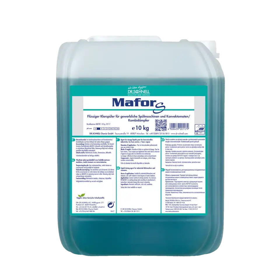 MAFOR S Universalklarspüler für alle gewerblichen und Haushaltsspülmaschinen. Optimale Spülergebnisse auch bei hartem Wasser. Zur exakten Dosierung empfehlen wir die Zugabe zur Spülflotte über ein DR.SCHNELL- Dosiergerät. In Kombination mit CONVECTOR auch zur Reinigung von Konvektomaten und Kombidämpfer geeignet.