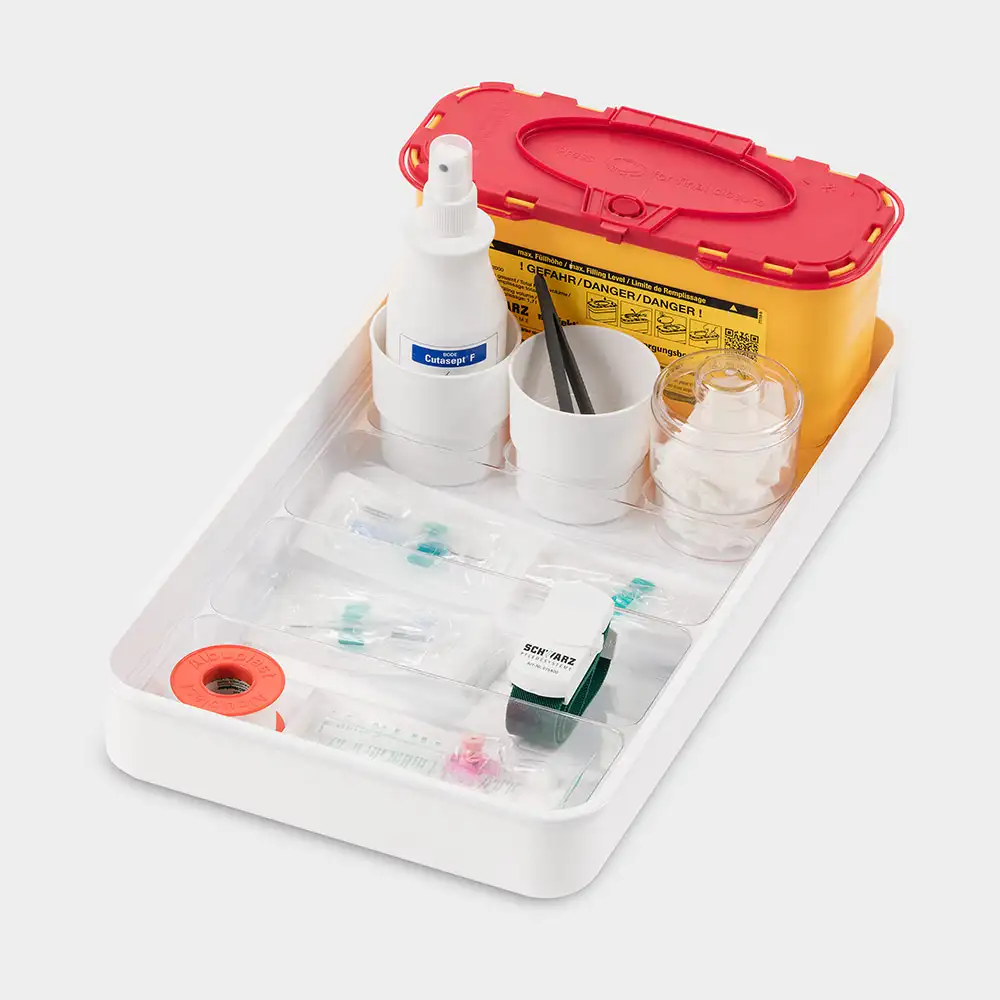 mit Tablett-Einsatz 1 Kanülensammelbox 2 Utensilienbecher rund und 1 Tupferbecher mit Deckel Außenmaße: L 433 x B 253 x H 55 mm