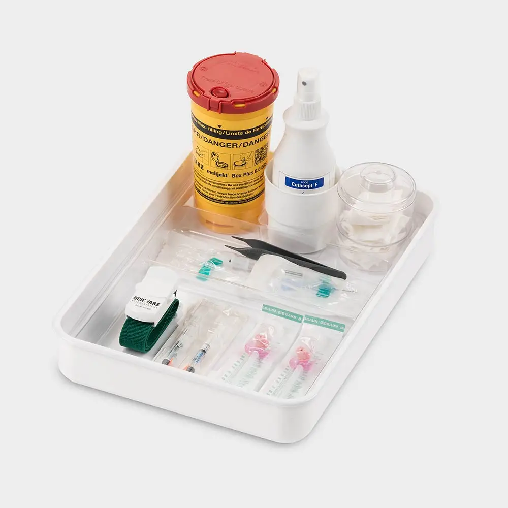 mit Tablett-Einsatz 1 Kanülensammelbox 1 Utensilienbecher rund und 1 Tupferbecher mit Deckel Außenmaße: L 353 x B 253 x H 55 mm