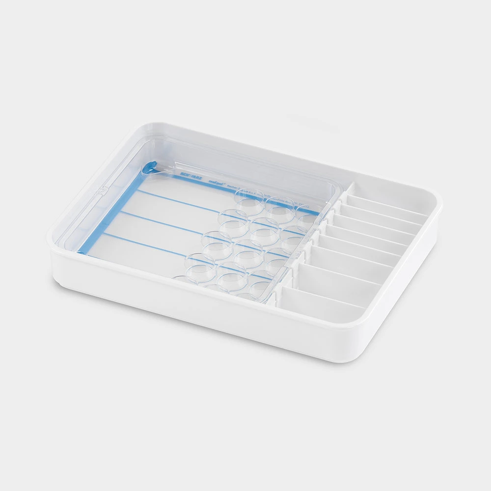 Mit variablen Fächern für Tropfen und Pulver-Tütchen Tabletteinsatz Beschriftungsfolie verschiebbarem Teilersystem und Folienstift. Maße: L 353 x B 253 x H 55 mm