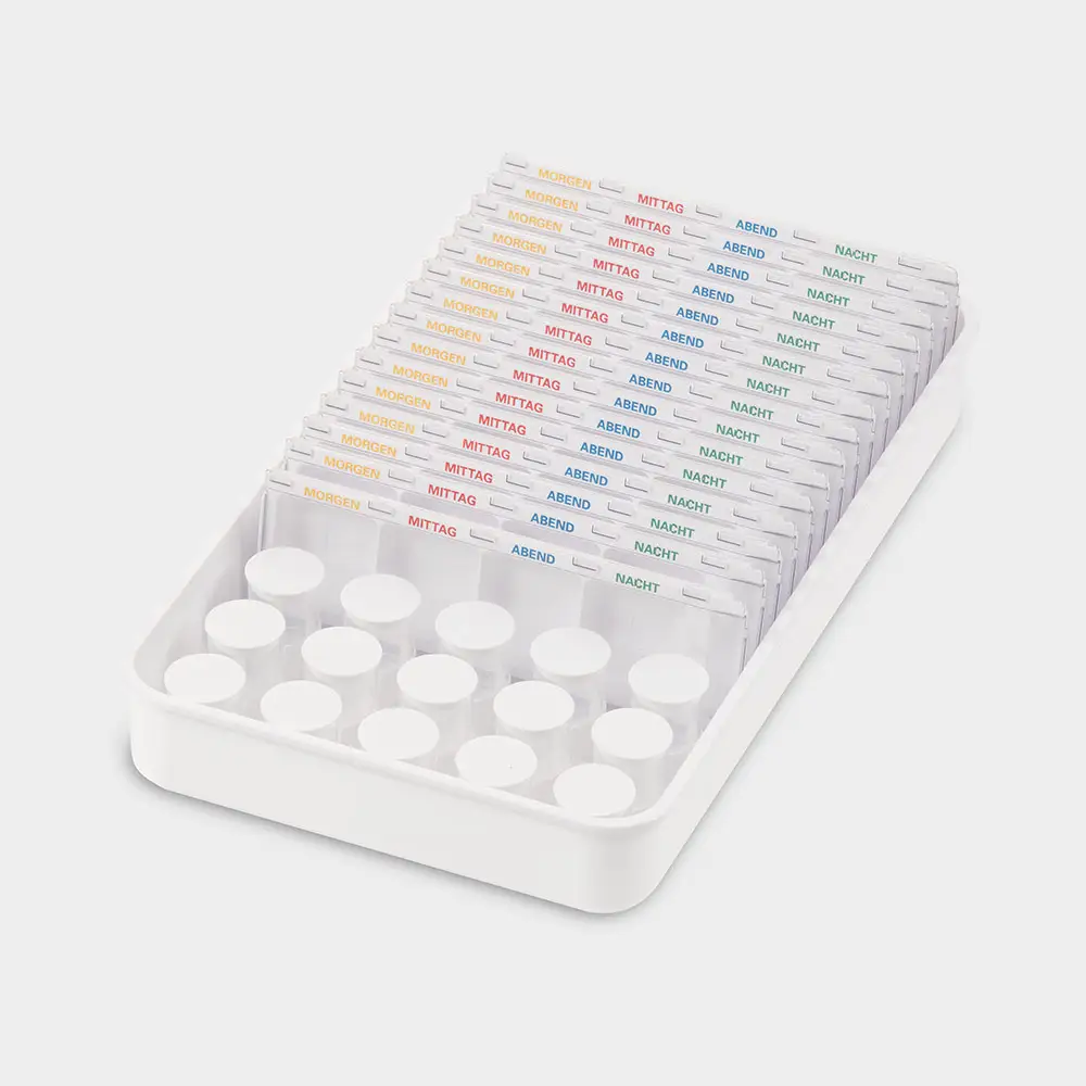 Becher können auf dem Beschriftungsdeckel gekennzeichnet werden für 15 Tagesdispenser und 15 Tropfenbecher Außenmaße: L 433 x B 253 x H 55 mm