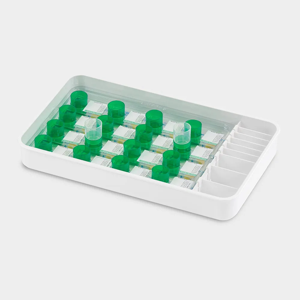 für 16 Bewohner mit Platz für 16 Becher-Blister und 16 Mehrweg-Medikamentenbecher für Bedarfsmedikamente Tabletten oder Tropfen mit Tablett-Einsatz Beschriftungsfolie Folienstift und variablen Fächern - Maße: L 433 x B 253 x H 55 mm