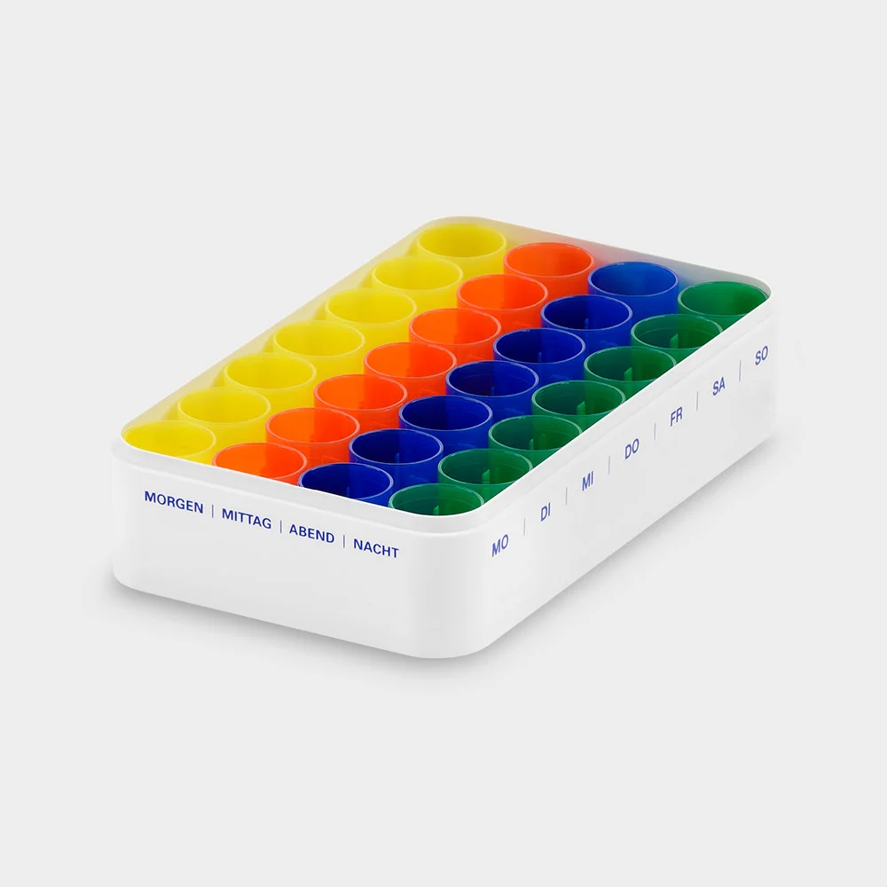 für 7 Tage stapelbar passend für melipul Mehrwerg-Medikamenten-Becher aus hochwertigem Kunststoff hygienegerecht spülmaschinengeeignet bis 93 C Beschriftung der Tageszeiten MORGEN MITTAG ABEND NACHT Aufdruck in blau Abmessungen: L 248 x B 145 x H 52 mm