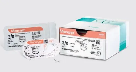 Monosyn ungefärbt, USP 4/0, Stärke 1,5, Nadeltyp HS23 mit einem Durchmesser von 70 mm.