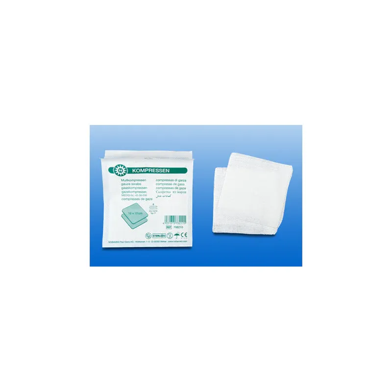 Steril verpackte 8-fach gelegte Mullkompressen aus 17-fädigem Verbandmull, zu 2 Stück einzeln verpackt, mit nach innen eingeschlagenen Schnittkanten. Die Mullkompressen dienen der allgemeinen Erstversorgung von Wunden, zur Wundreinigung, zur Wundabdeckung und zum Aufsaugen von Blut und Körperflüssigkeiten. Sie sind für den einmaligen Gebrauch bestimmt und sind so verpackt, dass sie mit dem Faltrücken nach oben liegen, so dass eine einfache Entnahme möglich ist.