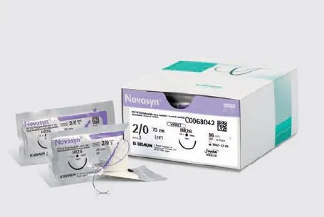 Nahtmaterial Novosyn ungefärbt, USP-Größe 6/0 (metrisch 0,7), mit Nadeltyp 2XDSMP7 und einer Länge von 45 cm.