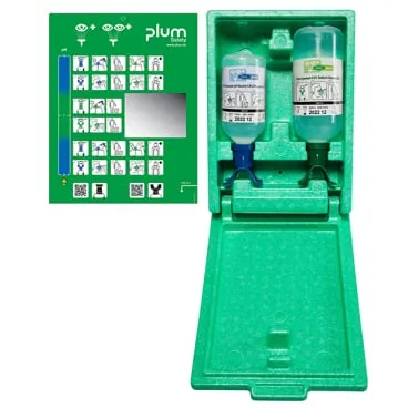 Staubgeschützte Wandbox mit 1 x 500 ml Augenspülflasche pH Neutral DUO (4,9 % Phosphatpufferlösung) und 1 x 1,0 l Augenspüllösung DUO (0,9 % Natriumchloridlösung). Die Flaschen sind mit einem Augenaufsatz zum gleichzeitigen Spülen beider Augen ausgestattet. Mit separater Piktogrammtafel mit Spiegel. Besonders für den Einsatz an Arbeitsplätzen geeignet, wo Säuren und Alkali sowie Fremdkörper in das Auge gelangen können.