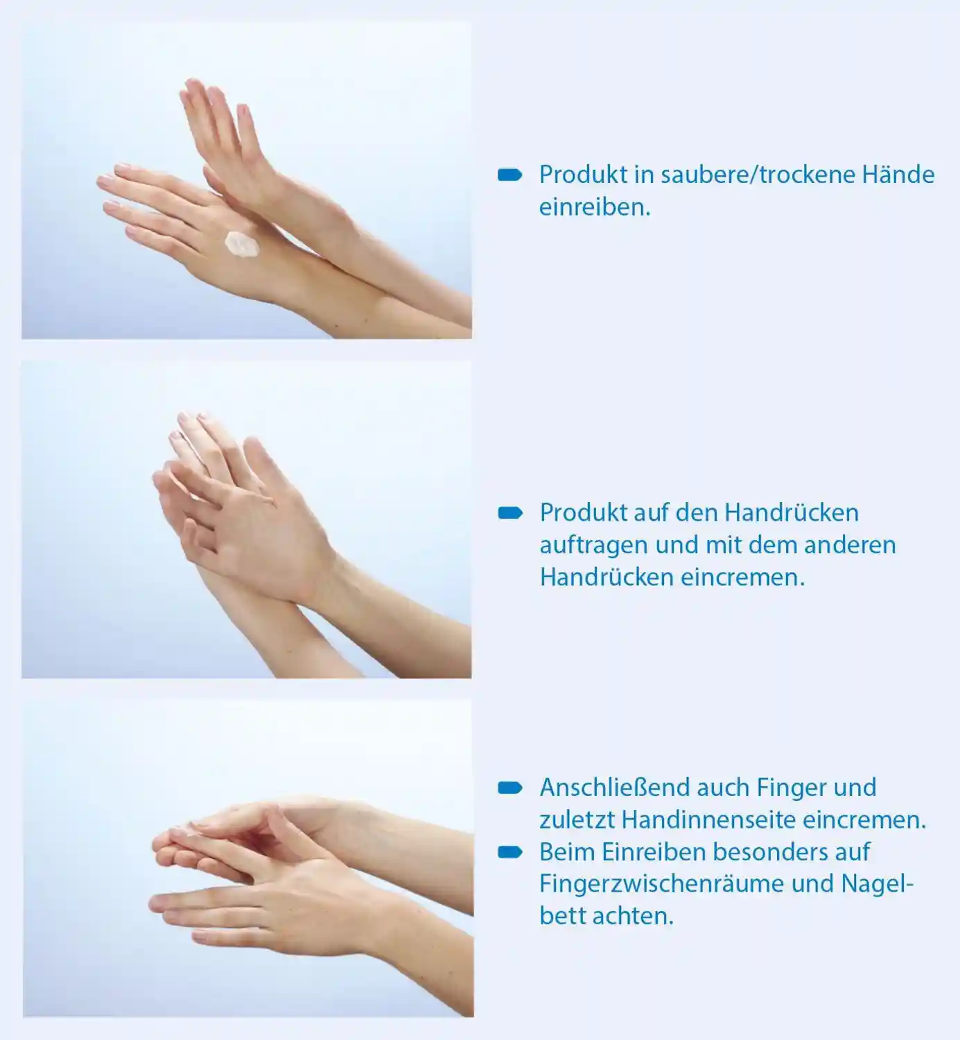Auf auf den Handrücken auftragen und zuerst Handrücken an Handrücken, dann die Handinnenflächen eincremen.