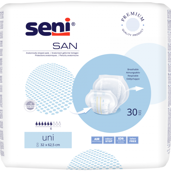 Die atmungsaktiven Inkontinenzvorlagen bieten optimalen Schutz bei Inkontinenz. Sie bestehen aus zwei anatomisch geformten Saugkissen aus Zellstoff (Seni San Prima - ein Saugkissen) mit Superabsorber. Die spezielle EDS-Schicht sorgt für eine schnelle Verteilung und Aufnahme der Flüssigkeit in den Saugkern. Ein flüssigkeitsabweisender, seitlicher Auslaufschutz mit elastischem Garn im Schrittbereich schützt vor Flüssigkeitsauslaufen. Der haftende Feuchtigkeitsindikator zeigt an, wenn die Vorlage gewechselt werden muss, indem sich zwei gelbe Streifen unter Flüssigkeitseinfluss in blau-grün verfärben. Die atmungsaktive Außenschicht sorgt für zusätzlichen Komfort und Hautfreundlichkeit.