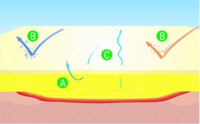 (A) bei Exsudataufnahme quillt das Hydrokolloid und bildet ein Gel, das Exsudat und Gewebetrümmer bindet